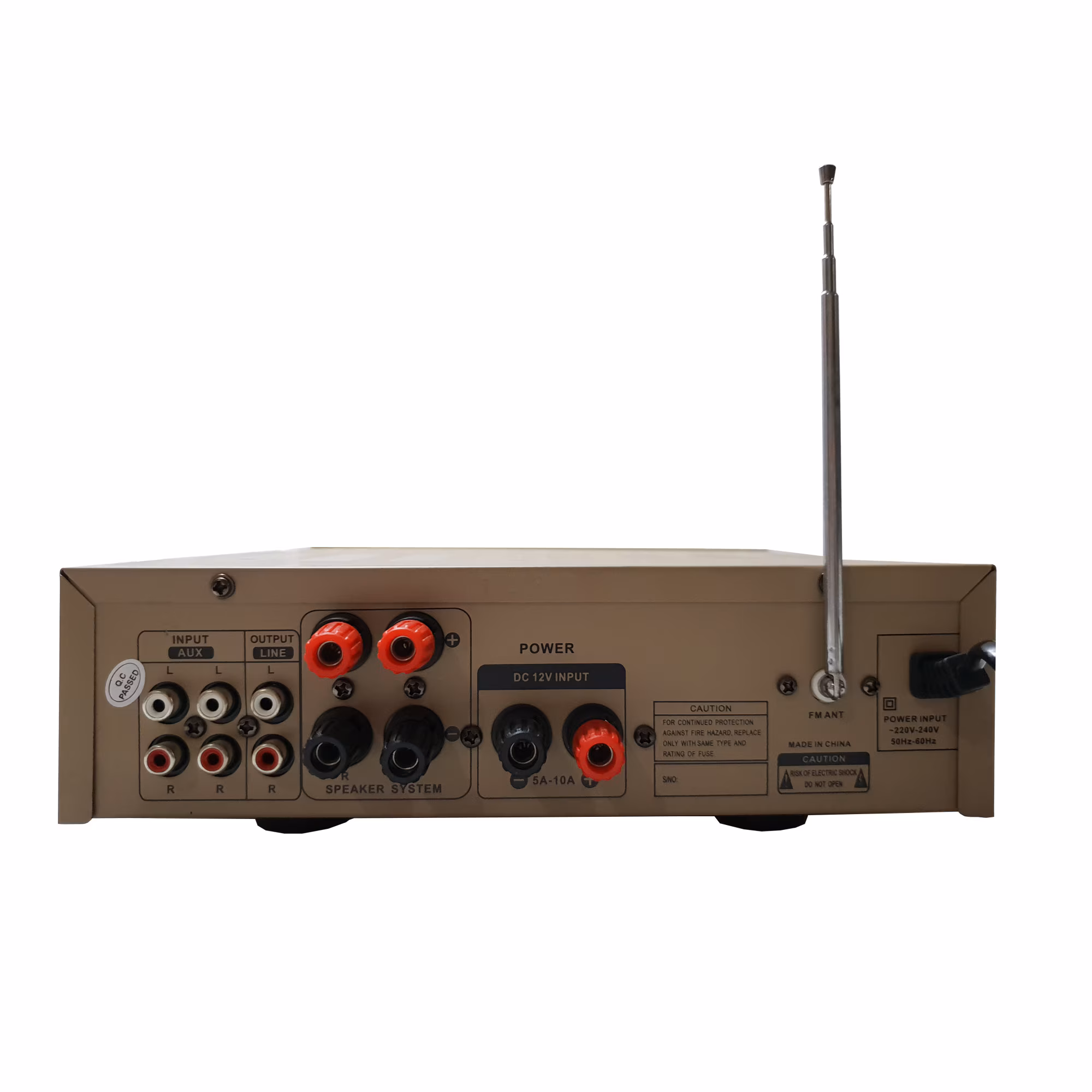 Acest amplificator este de asemenea echipat cu intrare USB si card SD pentru ascultarea directa a muzicii in format MP3 si 2 intrari pentru microfon cu reglaje ale volumului pentru a fi utilizate ca karaoke. Pe spate exista iesirile pentru difuzoare si cele 2 intrari auxiliare in format rca.