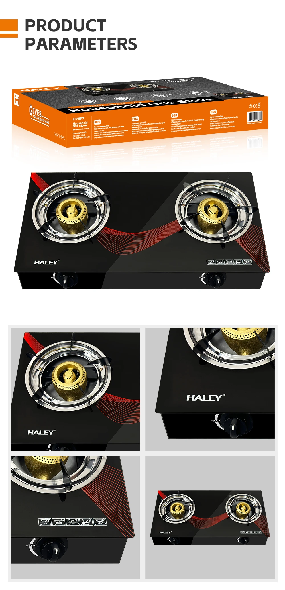 Cu panoul întărit și rezistent, aragazul este proiectat pentru utilizare zilnică, iar aprinderea printr-un singur click face controlul focului simplu și comod. Suportul pentru vase are un design special, tip gheară cu cinci colțuri anti-alunecare, asigurând stabilitate chiar și la vasele grele.