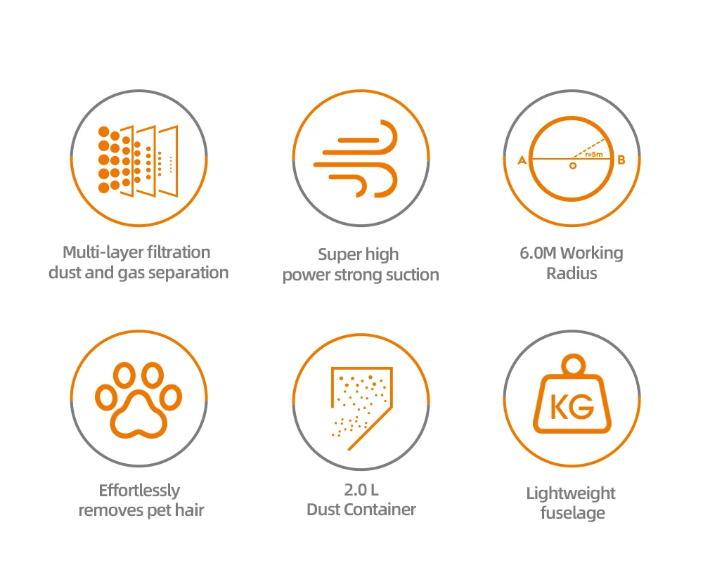Rază de acțiune de 6.0 metri: Permite aspirarea unei zone mari fără a fi nevoie de schimbarea frecventă a prizei.
