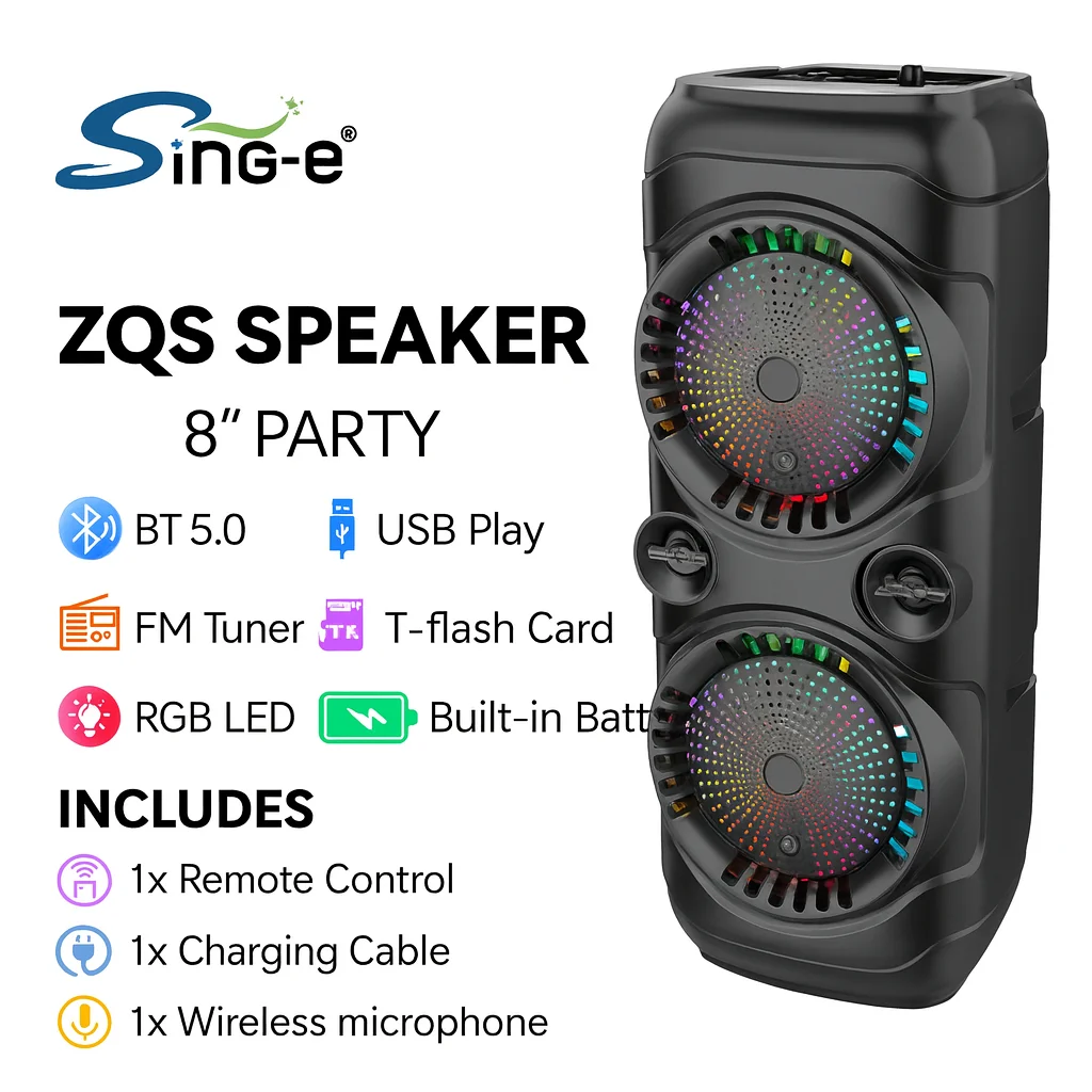 Transformă orice încăpere într-o adevărată atmosferă de petrecere cu boxa portabilă ZQS8229W, un sistem audio puternic, modern și ușor de utilizat. Cu două difuzoare de 8 inch, iluminare LED spectaculoasă și un sunet bogat în bass, această boxă este perfectă pentru evenimente, karaoke, petreceri sau momente de relaxare acasă.
