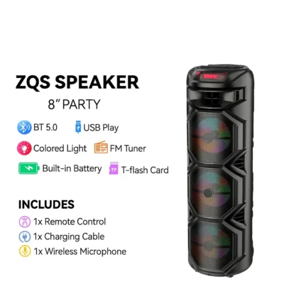 Transformă orice loc într-o petrecere adevărată cu Sing-e ZQS8301, boxa portabilă de putere mare, echipată cu lumini LED colorate și funcții perfecte pentru karaoke, evenimente, fitness, prezentări sau petreceri în aer liber. Cu un design modern, trei difuzoare de 8 inch și un sunet puternic, acest model este alegerea ideală pentru iubitorii de muzică și distracție.