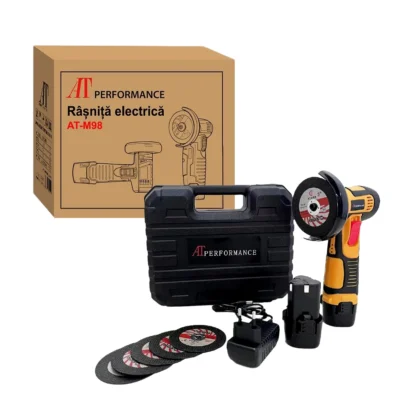 Prețul inițial a fost: 129,00 lei.69,00 leiPrețul curent este: 69,00 lei.Mini Polizor Flex Unghiular Portabil, AT PERFORMANCE®, 2 acumulatori 12V, 750W, 1500 mAh, 19500 rpm, 6 discuri 76 mm, Autonomie Mare