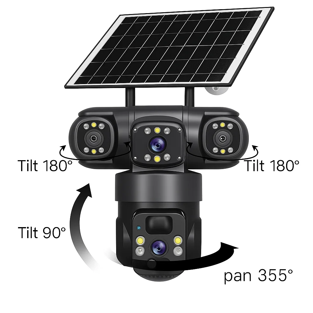 Această cameră de exterior cu 3 lentile și panou solar integrat oferă o acoperire panoramică reală de 360°, fiind ideală pentru curți, ferme, parcări, cabane sau spații comerciale.