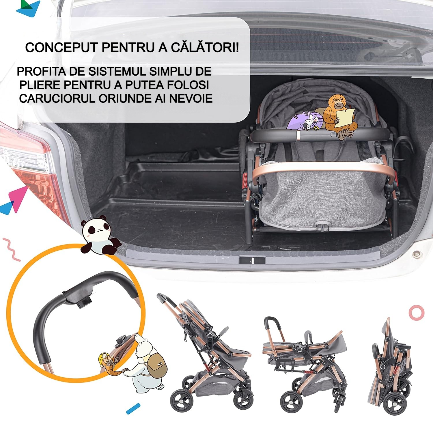 Roți pivotante 360° + sistem de frânare în trepte – plimbări line, sigure și control total în orice tip de teren urban;