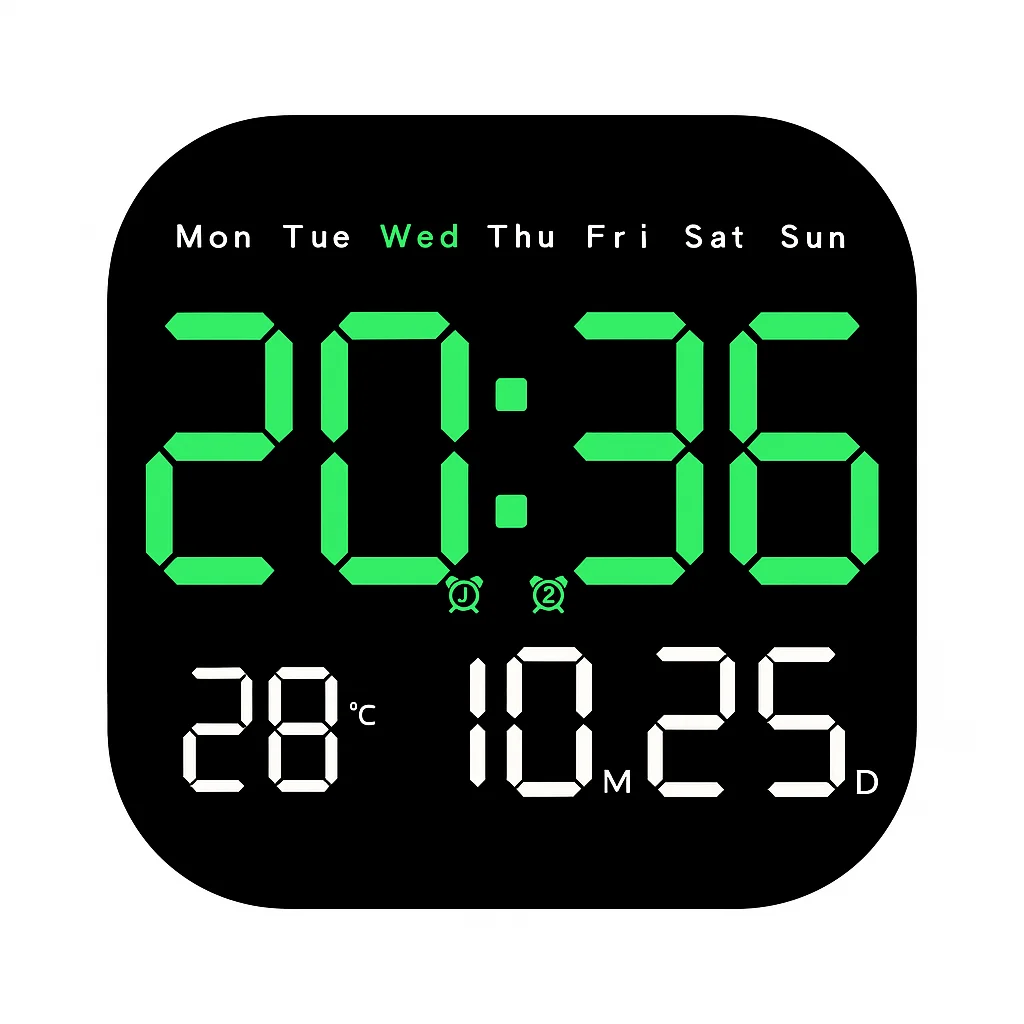 Ceas de perete digital cu telecomandă, AT PERFORMANCE®, data cronometrare, numărătoare inversă, conectare, utilizare ceas de masă, 2 alarme, ceas deşteptător cu LED DST cu reglare automată, verde