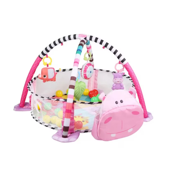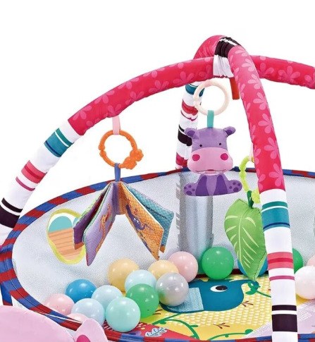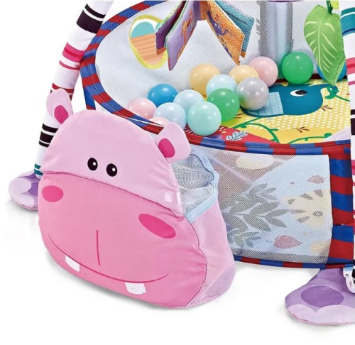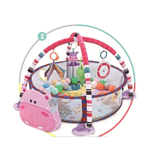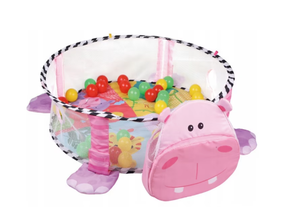 Centru de activitati multifunctional interactiv pentru copii si bebelusi,At Performance, 3 in 1, tip tarc, cu Bile moi multicolore si Jucarii interactive, Hippo Roz , 0 luni +