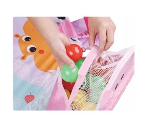 - Peretii exteriori se pot atasa pentru ca bebe sa se joace cu mingiutele incluse in set. Pe lateralele tarcului sunt doua gauri prin care bebe poate trece bilele dintr-o parte in alta.