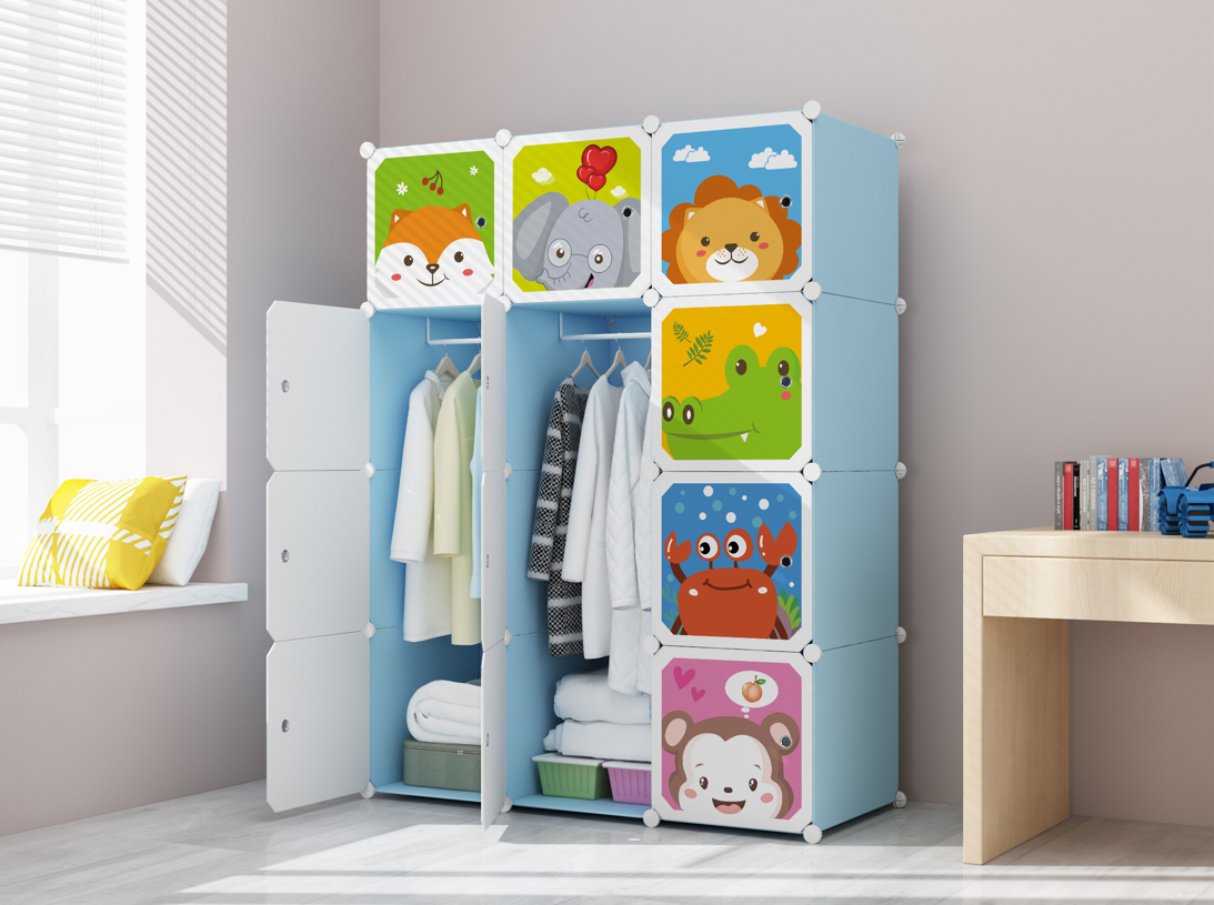 Dulap modular pentru copii, albastru, AT PERFORMANCE®, 12 rafturi, durabil, 76X37X147 cm, animalute zoo