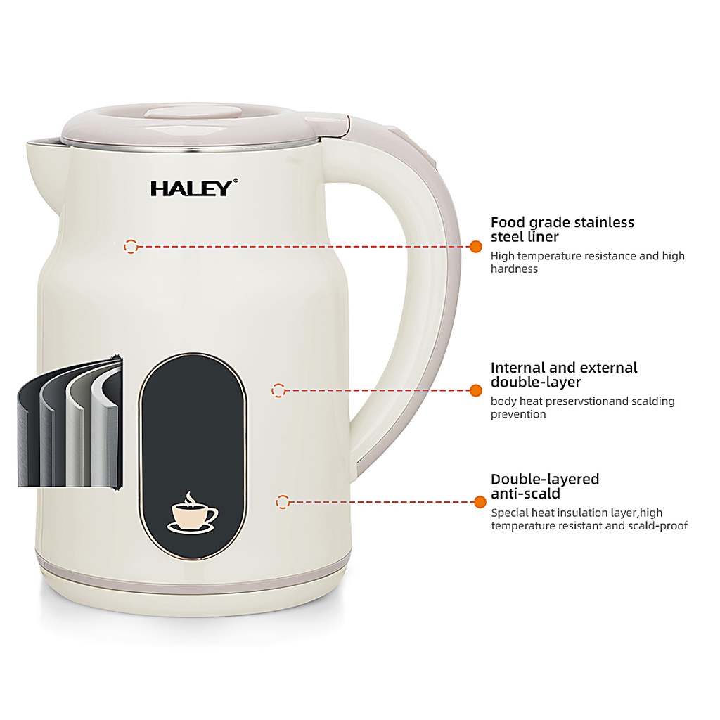 Bucură-te de apă fierbinte rapid și în siguranță cu fierbătorul electric HALEY HY-8977, ideal pentru prepararea ceaiului, cafelei sau altor băuturi calde. Cu o capacitate generoasă de 2.5 litri și o putere de 1500W, acest fierbător încălzește apa rapid, economisind timp și energie.