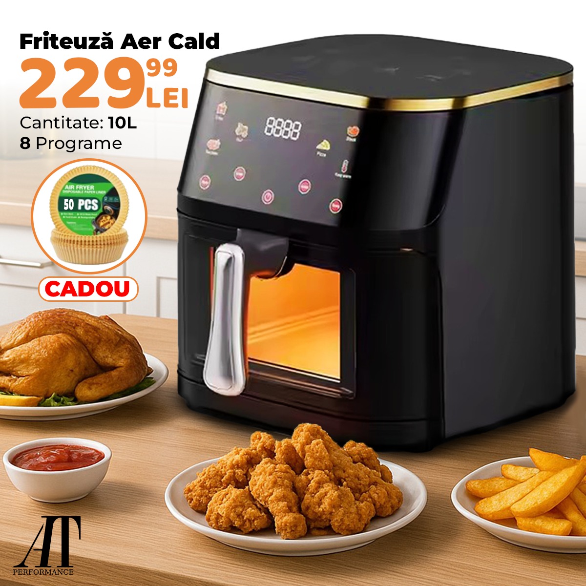 Friteuză cu Aer Cald 10L AT PERFORMANCE® – 2400W, Display Digital Touch, 8 Programe, cu Geam, Neagră + CADOU 50 Hârtii de Copt