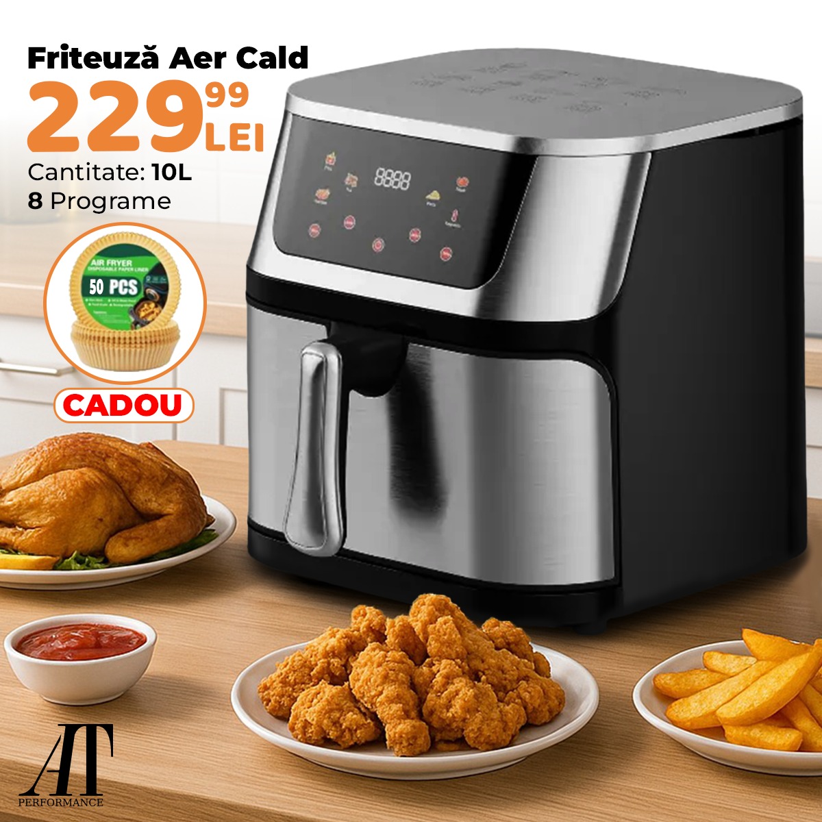 Friteuză cu Aer Cald 10L AT PERFORMANCE® – 2400W, Display Digital Touch, 8 Programe, Argintiu + CADOU 50 Hârtii de Copt