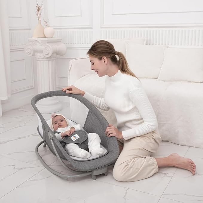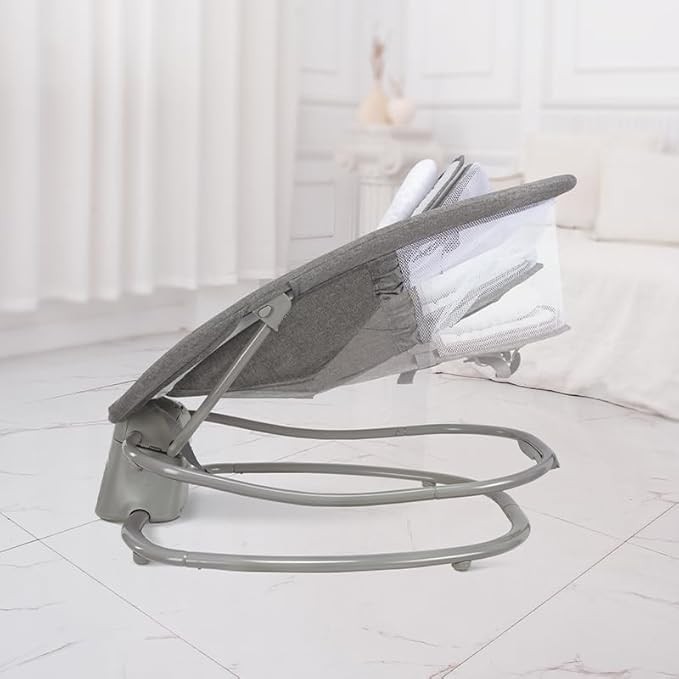 Harnașament în cinci puncte: alegem materiale metalice durabile pentru a face cadrul general. Harnașamentul în cinci puncte poate, de asemenea, să fixeze în siguranță copilul pe scaunul balansoar pentru a preveni alunecarea copilului. Designul lateral din plasă respirabilă crește circulația aerului și permite observarea constantă a mișcărilor bebelușului,Convertiți convenabil în balansoar pliabil, ușor de transportat sau de depozitat .Acest balansoar poate fi balansat la stânga și la dreapta sau blocat pentru a-l menține în poziție. două jucării drăguțe pot stârni rapid curiozitatea unui copil.