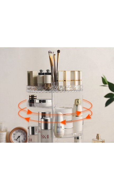 Organizator cosmetice rotativ 360° organizeaza eficient si atractiv rujurile, lacurile de unghii, accesoriile de machiaj,si se pot stoca cosmetice, dar si medicamente sau obiecte de igiena personala sau bijuterii.