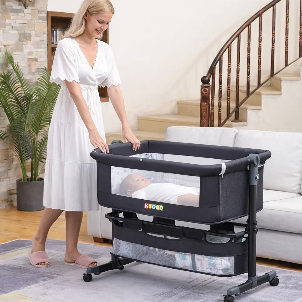 Pătuț Reglabil 6 în 1 KIDOO ® pentru Bebe – Leagăn, Pătuț de Călătorie, Coș Depozitare, Plasă Țânțari, Saltea Moale, Roți 360°, Gri