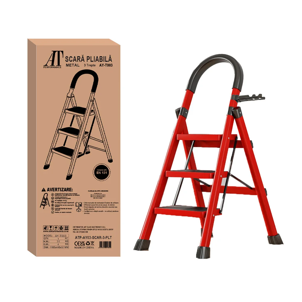 Scara Pliabila cu 3 Trepte Late, At Performance, 72x59x41 cm, Metalica, Maxim 150 Kg, Picioare Antialunecare, Rosu-Negru.