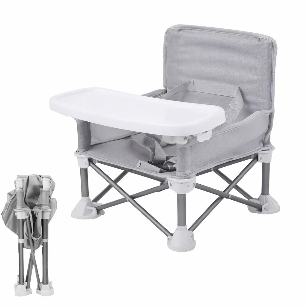 Scaun bebe, pliabil, compact, portabil, usor de depozitat, cu tava detasabila, pentru masa si joaca, cu spatiu de depozitare, ham de siguranta in 5 puncte