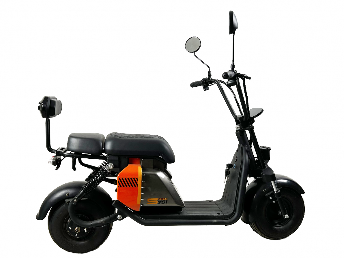 Confort și siguranță: Scuterul 701 MINI este echipat cu suspensii îmbunătățite, frâne eficiente și faruri pentru vizibilitate sporită.