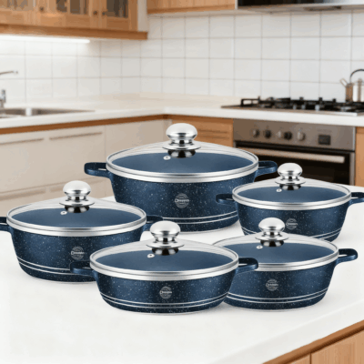 Capacele din sticlă semitransparentă permit monitorizarea preparatelor fără a pierde căldura, contribuind la o gătire mai eficientă. Setul include cinci oale în dimensiuni variate, ideale pentru orice tip de preparat, de la supe și tocănițe până la prăjeli sau garnituri.