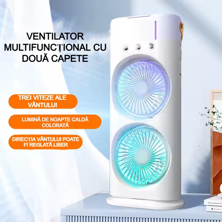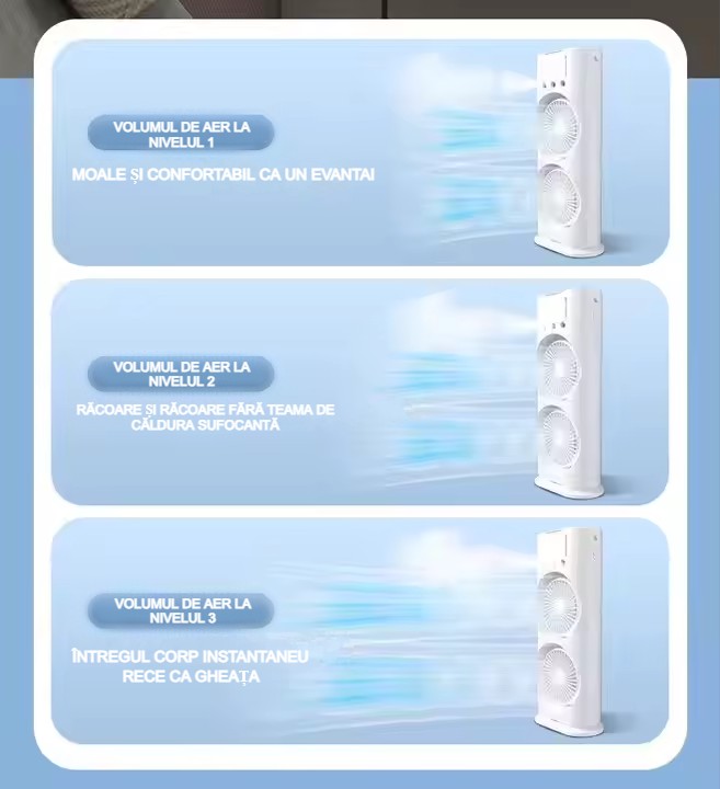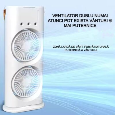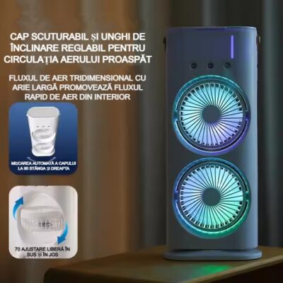 Dotat cu o baterie puternică de 2000 mAh, acest ventilator este portabil și ușor de utilizat în orice spațiu: birou, dormitor, bucătărie sau chiar în deplasare. Este prevăzut cu 3 jeturi de pulverizare fină (misting jets) care pot împrospăta aerul, iar iluminarea LED discretă adaugă un plus de stil și funcționalitate, mai ales pe timp de noapte.